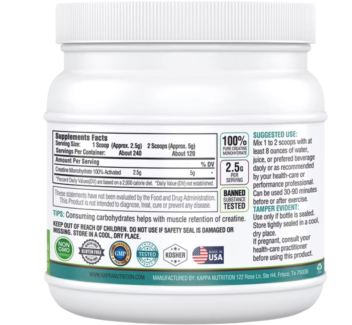 Monohidrato de creatina micronizada, sin aditivos ni rellenos. Apta para veganos y libre de gluten.